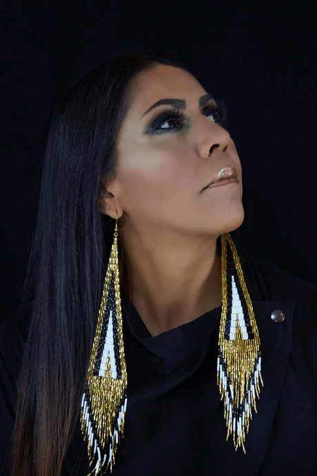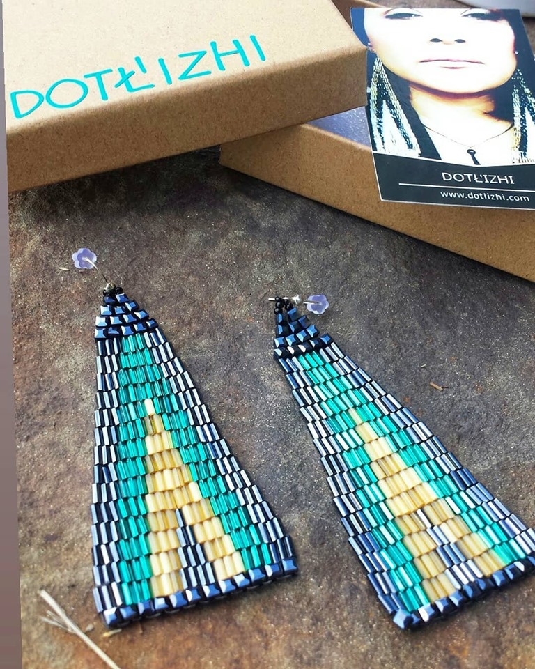 Elegantly hand woven together to create these triangle shaped earrings. Adorned with glass beads and finished with gold plated hook ear wire.