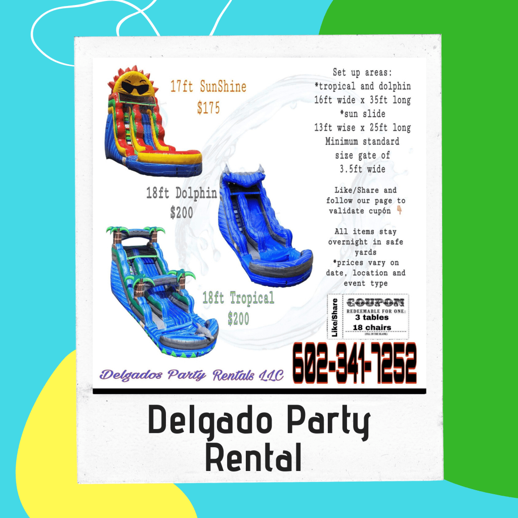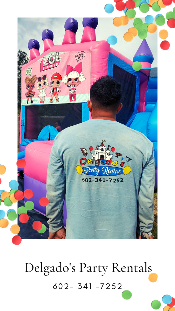 Delgado’s Party Rentals provides the set up for all bouncy houses, jumpers, waterslides and the mechanical bull. Everything is taken care of! With delivery available throughout the Phoenix valley.