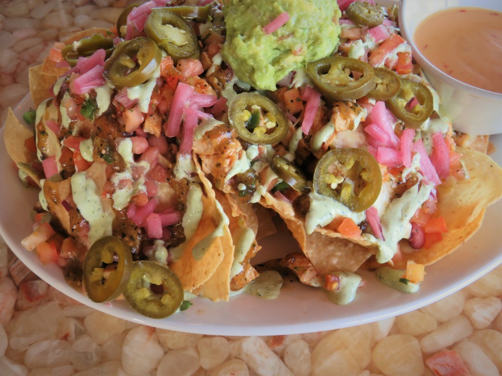 jalapeno cheese sauce, tomatillo salsa, cilantro sour cream, pico de gallo, house bean salsa, green onion, pickled jalapeno & guacamole. Served with red chili cheese sauce for dipping | 13