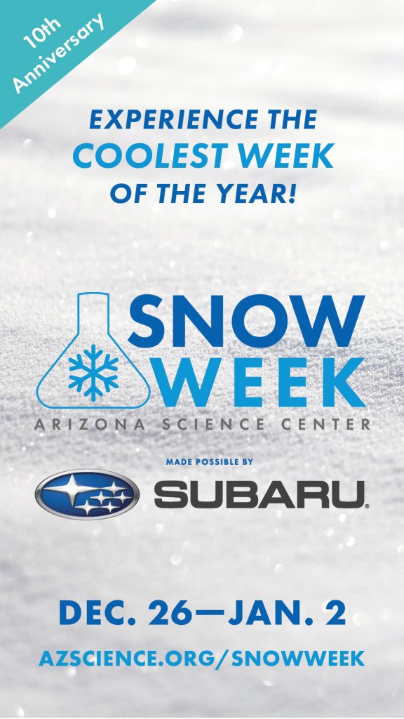 Mark your calendarsβsnow is in the forecast this December! Arizona Science Centerβs Snow Week, made possible by Subaru, returns for its tenth anniversary with a blizzard of activities the whole family will love. βEnjoy subzero science with our dazzling demonstrations on the hourβ, Penguin Skating and even build your own Snowpal!