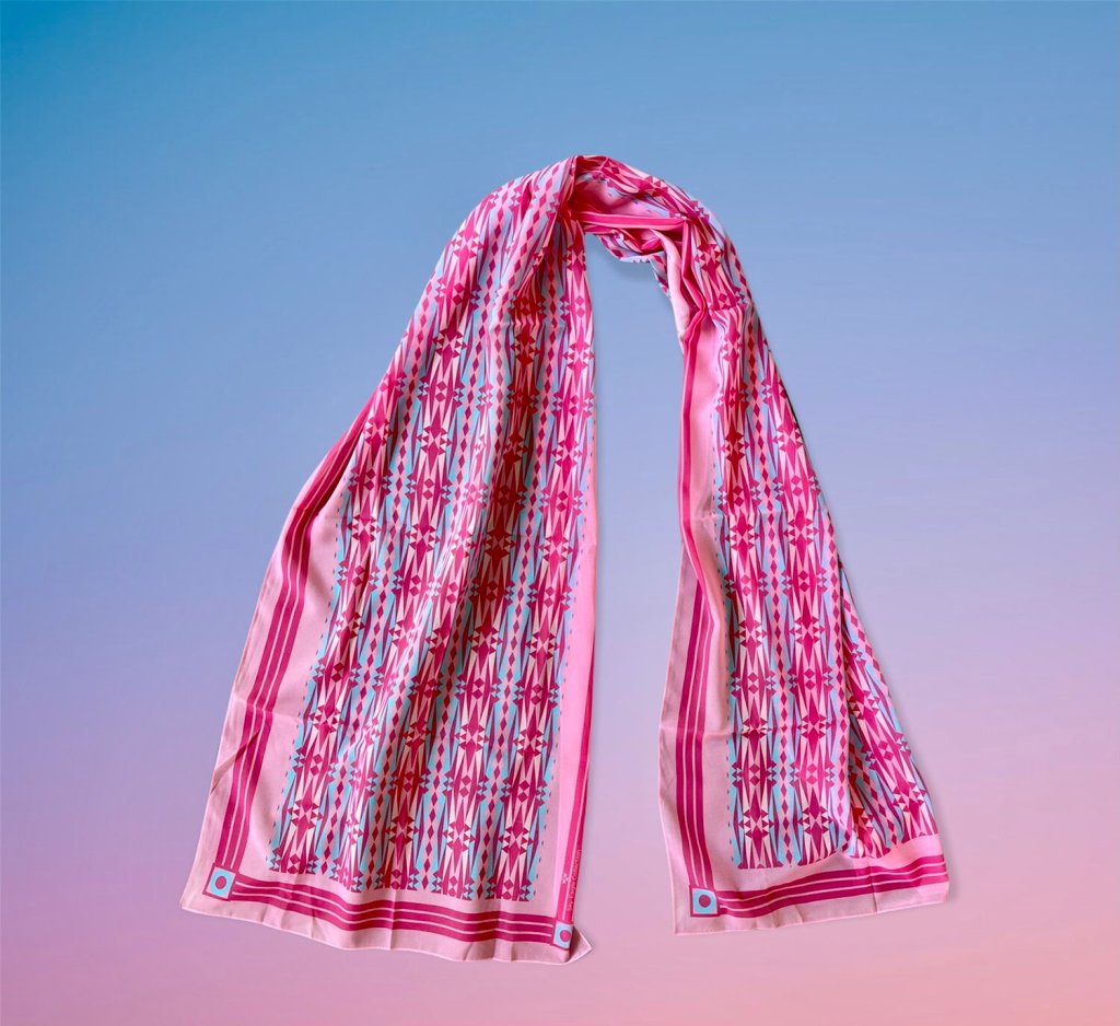 Extra Large Silk Scarves: Custom Scarves by Osage Fashion Designer Dante Biss-Grayson. High Quality Silk and oversized that enable many different options for the wearer. Many styles that include modern plains ribbon work inspired designs and orthography designs that speak to the resilience of tribes taking back their language. This is Contemporary Native Fashion.