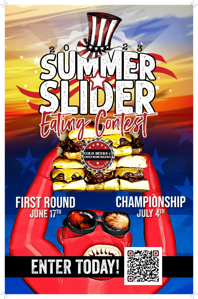 - Cold Beers & Cheeseburgers Summer Slider Eating Contest Championship on mainstage with 14 finalists gobbling the goods for a grand prizes!