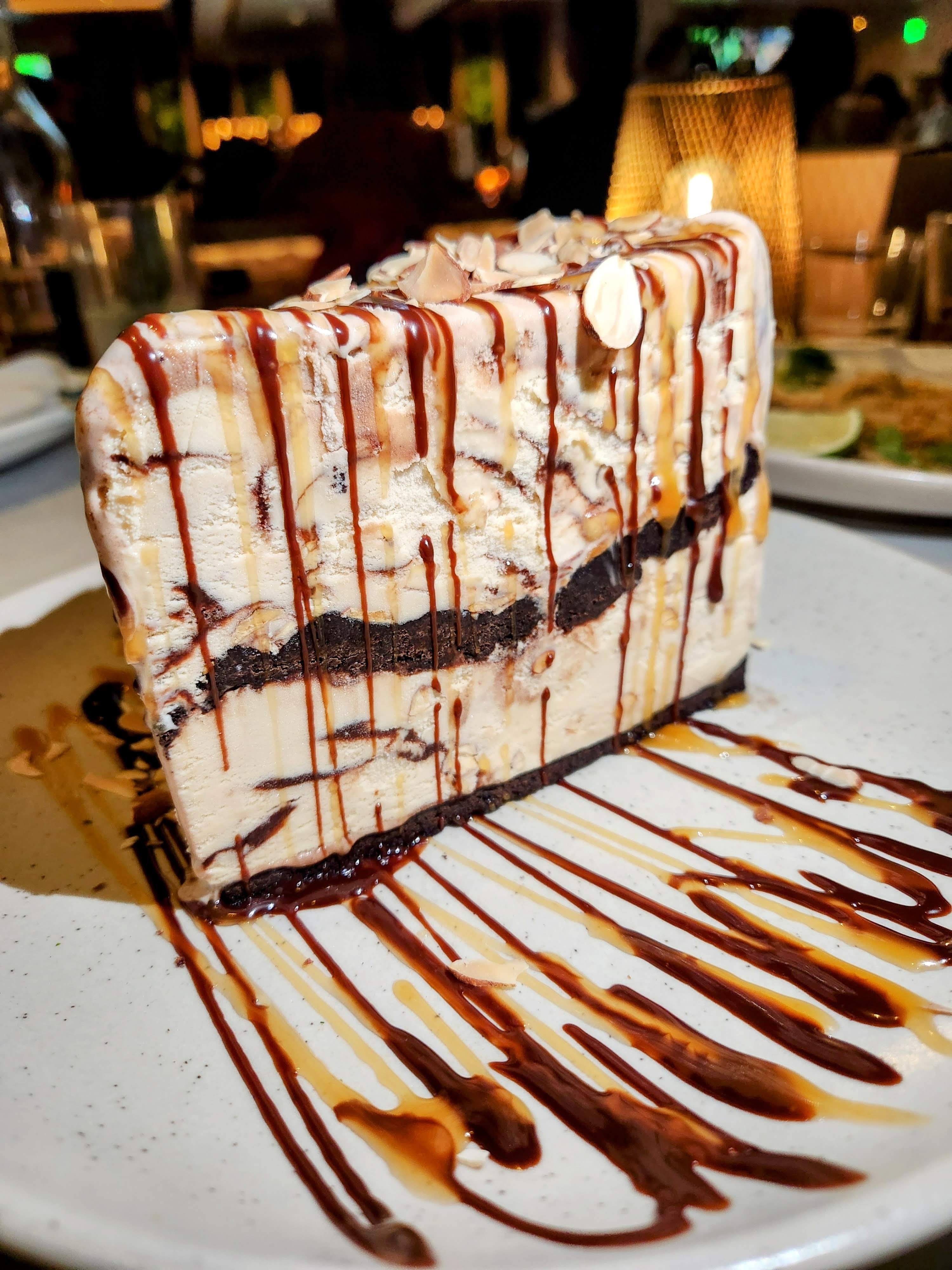 Mocha ice cream with layers of fudge , almonds, cookie crumble
