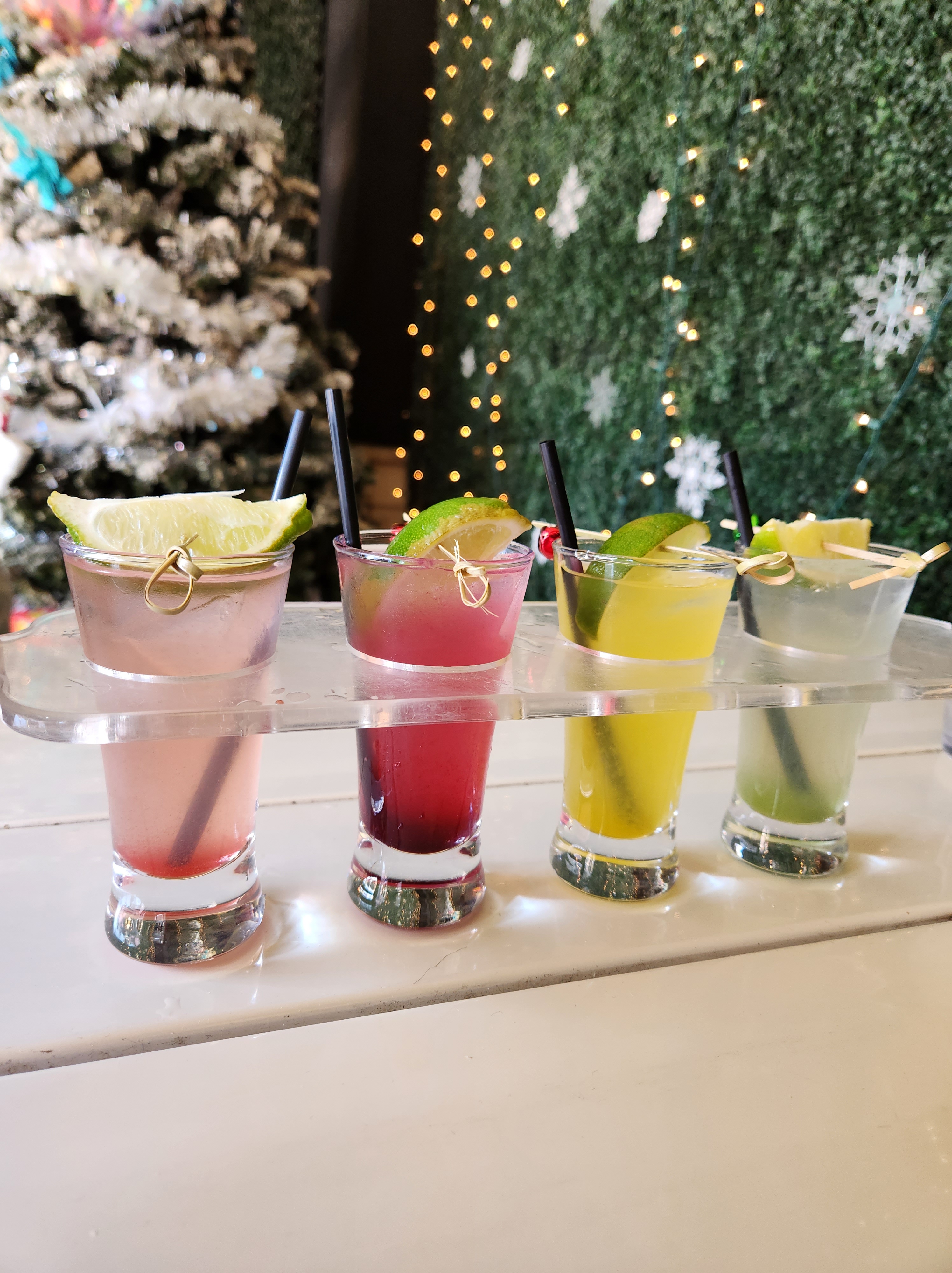 For our holiday specialty cocktails we savored the Mistletoe Margarita Flights for $18 – four mini super cute colorful cocktails. Blood orange, Honey, Blackberry Mint & Kiwi Strawberry, Under the Mistletoe.