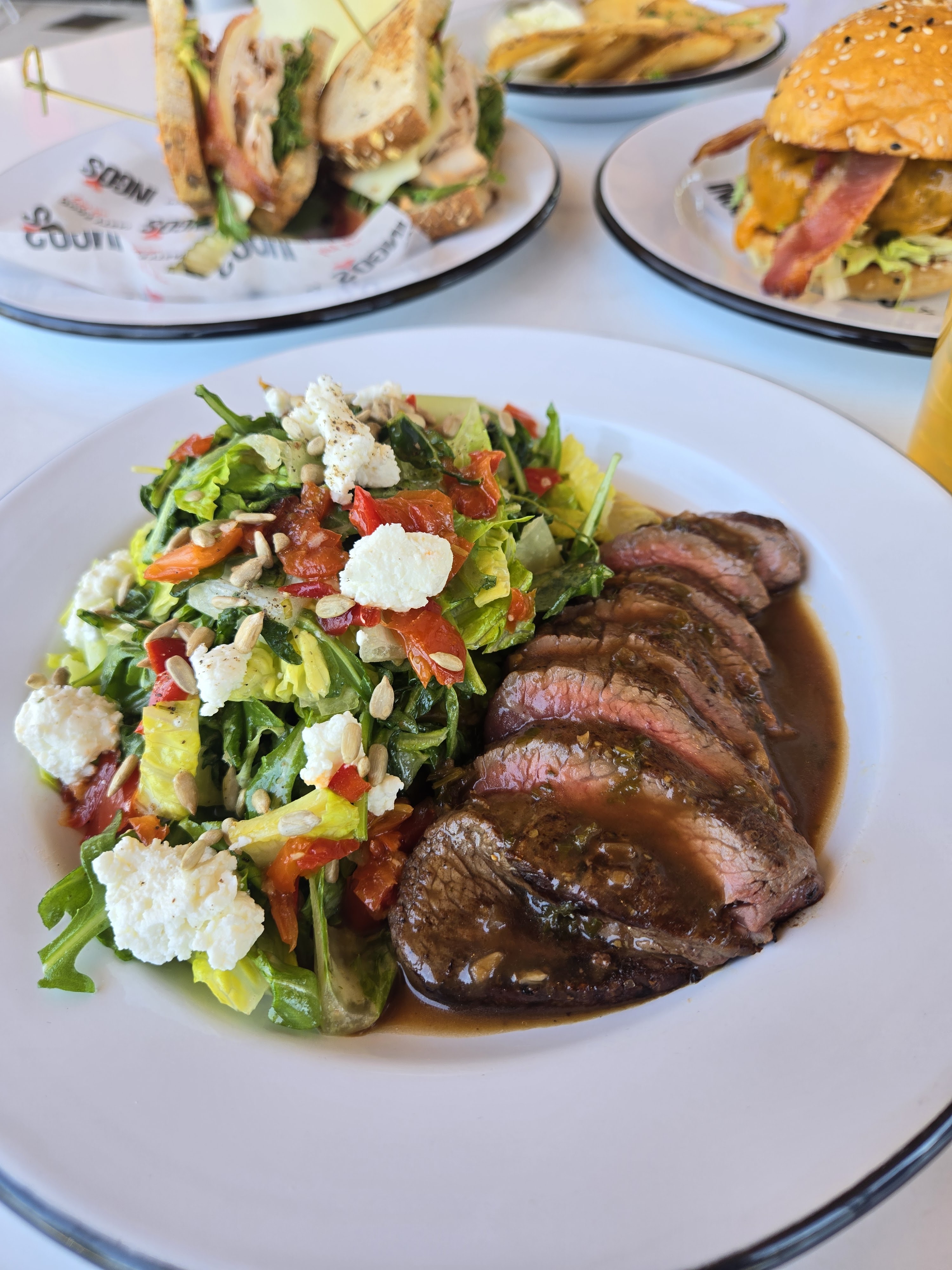 Salad: Bistro Steak Salad- Bistro filet, gremolata pan sauce, mixed greens, Mama Lilโs peppers, laurel Chanel goat cheese, house vinaigrette