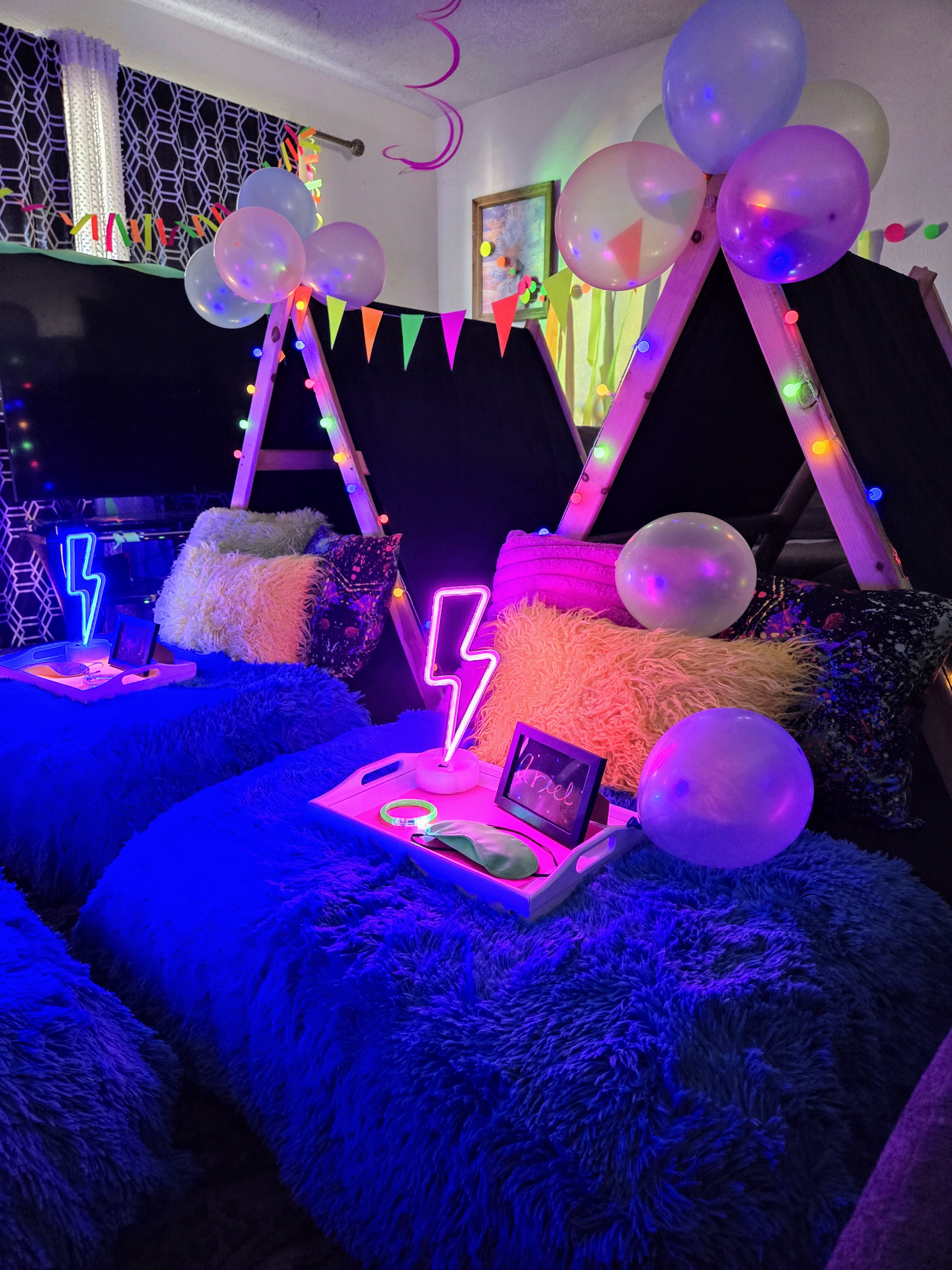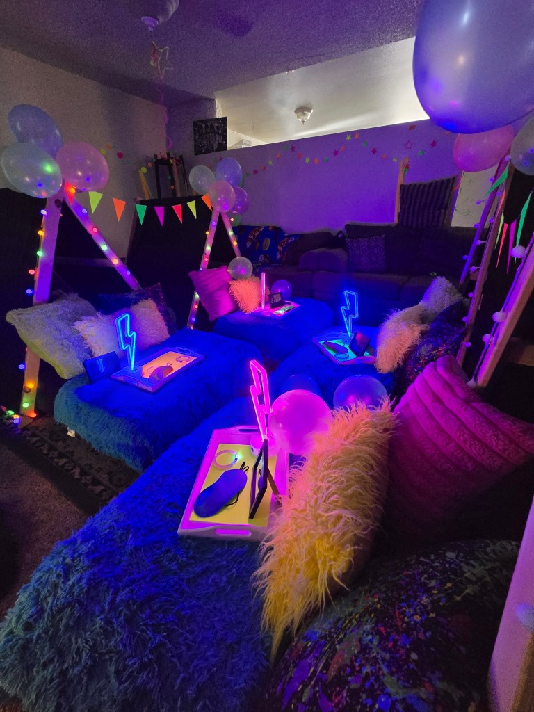 An Everyday Party will include a themed setup for each camper: tent, mattress, waterproof mattress pad, fitted sheets, blankets, pillows, accessories.
